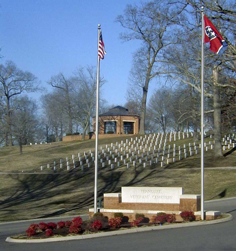 Historical - Entrance to the Tennessee Veteran's Cemetery where numerous veterans from the state serving in all wars are buried. Stark white gravestones, line the rolling hills of the grounds here in Knoxville. Located at 5901 Lyons View Pike, It is open daily.