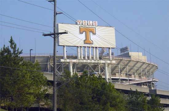 UT Football Jumbotron - This is the backside of the jumbotron scoreboard for UT football games at Neyland Stadium.. Instant replays are shown for review of the fans who regularly fill it during football season.